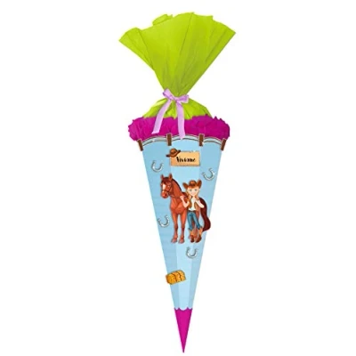 School cone made of 3D coloured corrugated cardboard 260 g/m² for DIY and designing Contents: school cone blank, 2 rolls of craft crepe, satin ribbon and various punching parts Finished school cone: hexagonal with horse and rider motif, height approx. 68 cm, diameter approx. 20 cm All parts are pre-cut, Manufacturer: Buntpapierfabrik Ludwig Bähr GmbH & Co. KG