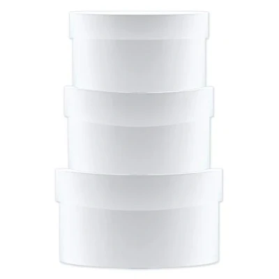 Blank gift boxes to design yourself Contents: 3 round boxes Available in 3 different sizes Made from white laminated cardboard 1.5 mm