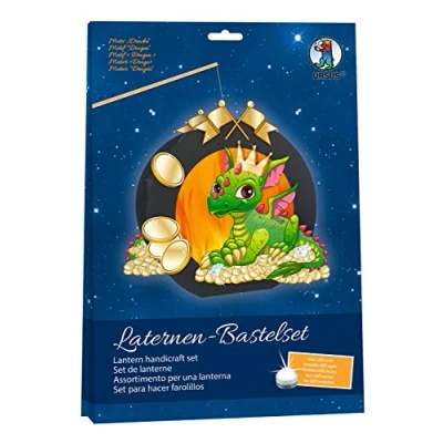 Dragon Lantern Craft Kit Ready in just a few steps, little time required, ideal for beginners. Contents: one lantern - round cut part, craft card 220 g/m², printed on both sides, 2 sheets of transparent paper 115 g/m², round approx. Diameter 17 cm, 2 punched sheets, printed on both sides, partially finished with hot foil in gold, a lantern carrying handle, a lantern - wooden stick (3 pieces), a LED light, includes 2 batteries (type CR 2032), an adhesive pad, adhesive pads. Size: approx. 24.8 x 31.5 cm.