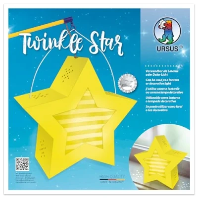 Twinkle Star colour: yellow Size: approx. 19.3 x 18.3 x 8 cm Contents: 1 lantern – blank star, made of photo card 300 g/m² lasered and grooved, 2 stars made of transparent paper 115 g/m², one lantern carrying handle Photo card 300 g/m² Includes instructions (English language not guaranteed)