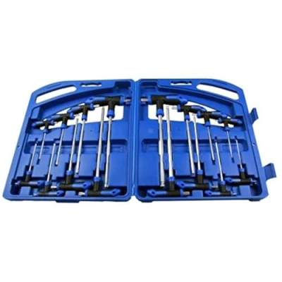 Sizes: H2 x 75mm, H2.5 x 75mm, H3 x 100mm, H4 x 100mm, H5 x 150mm, H6 x 150mm, H8 x 200, H10 x 200mm 8 PC Torx: Sizes: T10 x 75mm, T15 x 75mm, T20 x 100mm, T25 x 100mm, T30 x 150mm, T40 x 150mm, T45 x 200mm, T50 x 200mm Made from heat treated chrome vanadium steel Chrome Vanadium steel blade Mirror polished T Handle design - increases turning power Ergonomically designed soft touch handles (For a better & safer easy grip) Supplied in a blow moulded storage case