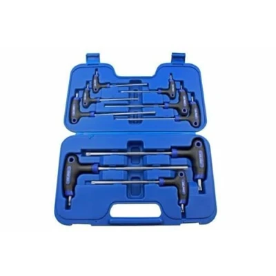 General description US PRO 9pc T10 - T50 T Handle Torx Star Key Set is a professional toolset designed for both DIY enthusiasts and professionals. This set includes a variety of Torx star keys with T handles, providing excellent grip and leverage for efficient use. Technical specifications Contents: T10x100 mm, T15x100 mm, T20x100 mm, T25x150 mm, T27x150 mm, T30x150 mm, T40x150 mm, T45x200 mm, T50x200 mm Item Code: 1613 Finish: Satin Finish Usage This Torx star key set is perfect for a variety of applications, including automotive repairs, electronics, and furniture assembly, making it an essential addition to any toolbox.
