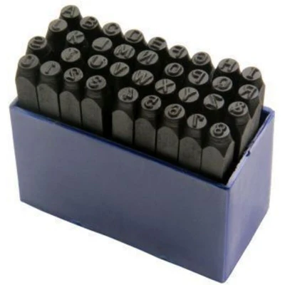 36pc letters and number stamps set. Stamp your name, ID, initials, postcode on most metal surfaces. Specifications - Supplied in a plastic storage case Fully forged Letter depth: 1mm Letter size: 4mm Carbon steel tempered black finish Numbers : 0 - 8 ( use 6 upside down for 9 ) Letters from A - Z and the ( & ) symbol