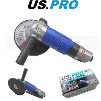 General description US PRO AIR ANGLE GRINDER is a heavy-duty 5" (125mm) air angle grinder designed for professional use. It comes with a 1-year warranty and is ideal for various cutting and grinding tasks. Technical specifications Free Speed: 10,000 RPM Average Air Consumption: 6 CFM Air Pressure: 90 PSI Bore: 22.2mm Connection: 1/4" BSP Angle: 90 degrees Overall Length: 228mm Weight: 1.9 kg Includes: 5" x 1/2" x 7/8" grinding disc