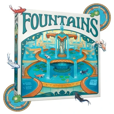 Fountains is a light strategy competitive tile-laying game where players become master Fountaineers working to build a magnificent fountain in the city of Florimelle. On a turn, move one of the tokens — green, blue, white — 1-3 spaces clockwise around the central board, skipping occupied spaces, to land on an empty space. You then take the top tile next to this token and add it to your board. You can expand out or up or both, but you want to ensure that you have a spout at your highest level and water flowing through all of your lower levels or else you'll have dead zones that won't score. If you stop next to the tiny oval features instead of a tile stack, choose one of these features and add it to an empty space in your fountain. When a player hits a point threshold, players then score for all three colours once again, as well as endgame bonuses such as 2 points per coin icon and 4 points for a set of fish in the three colours., Manufacturer: USA-OPOLY