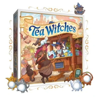 Tea Witches is a worker placement game set in the fantasy world of Britewitch City. Players compete as witches running magical tea huts, in hopes of being the best in show at the annual Teaquinox Faire. The game lasts four rounds, each representing one day of the Teaquinox Faire. Completing tea orders, attracting celebrities, earning money, and upgrading your tea hut will earn players prestige. At the end of the fourth day, the player with the most prestige will be declared the greatest tea witch of the Teaquinox Faire!, Manufacturer: USAopoly