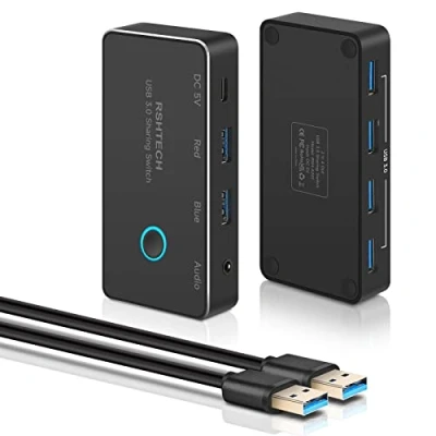 2 In 5 Output USB 3.0 Switch: Allows 2 computers to share 4x USB 3.0 ports and 1x 3.5mm audio port. Perfect for connecting printers, mice, keyboards or USB flash drives, card readers, hard disks, headphones and more. Faster Data Transfer Speeds: USB 3.0 switch support data transfer speeds up to 5Gbps, 10 times faster than USB 2.0, saving you time waiting for data transfer. Plug and play, no driver required One-Button Switch: Switch shared USB devices between two computers with one button, reducing the trouble of plugging and unplugging USB devices. Blue and red led lights easily indicate active computer. 4Ft Long USB Cable: RSHTECH USB 3.0 switch is designed with high-quality aluminum alloy, sturdy and durable. 1.2m/4ft meters USB 3.0 cables can expand the host's USB port to the desktop, making your USB connection more convenient. Package Includes: 1x RSHTECH USB 3.0 Sharing Switch, 2x 1.2m/4ft USB 3.0 Cable, 1x User Manual and Friendly Customer Service