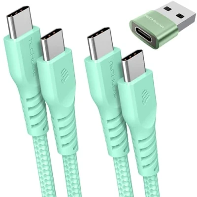 [DUAL LENGTH PACK + ADAPTER] Includes 1× 1M and 1× 2M USB-C to USB-C cables plus 1× USB-C to USB-A adapter. Ideal for home, work, car, or travel – use the 1M for desktops and the 2M for bedside or sofa charging convenience. [60W Fast Charging] TECHGEAR Type C to Type C Cable provides fast charging up to 60W (20V/3A) to all USB-C devices that support PD/QC 4.0. It supports PD, QC and FCP fast charging technologies. (Note: This is USB C to USB C cable not USB C to USB A cable, Charging speeds also depends on your device and charger!) [Data Transfer & Sync] This USB C PD cable supports data transmission up to 480Mbps (40-60MB/s) based on USB 2.0. *Note: This Cable does not support Video Out. [Strong & Durable Build] Premium braided nylon with reinforced strain relief, laser-welded metal tips and internal fibre core. Built to withstand over 45,000 bends – perfect for travel, home or office use. [Perfect for Your iPhone 17/16/15] Our premium USB-C to USB-C cable ensures reliable charging for your iPhone 17 series. Stay powered up and connected without compromise. *Tested to charge your iPhone 15 up to 50% in 30 minutes. [Wide Compatibility] This USB C to USB C charging cable (not USB A to USB C) is compatible with all USB-C devices, such as iPhone 17//Pro/Pro Max/Air, Samsung Galaxy S26 S25 S24 S23 S22 S21 S20 Ultra/Plus/FE/Edge, Note 20/A15/A16/A17/A35/A36/A55/A56/A05s, iPad Pro 2024/2022/2021, IPad Air 11"/13"/4th/5th Gen, iPad Mini 7th/6th, iPad A16 11th/10th, MacBooks, Redmi Note 15/14/1312/11/10, Pixel 10/9/8/7/7a/6/6a, Honor Magic 8/76/5/4/90/70/X5 and more, PS5/XBox One Controller, Switch 2 OLED/Lite [TECHGEAR QUALITY GUARANTEED] UK brand since 2012 – trusted for premium, safety-tested charging accessories. Includes 1× 1M + 1× 2M USB-C cables & 1× USB-C to USB-A adapter. Backed by UK support and 12-month warranty.