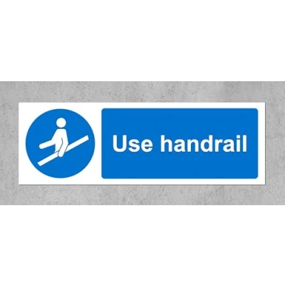 Use handrail safety sign Self adhesive sticker 300mm x 100mm Remove backing film and apply to dry, smooth, oil free surface. Digitally printed and laminated for extra durability