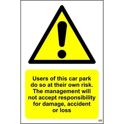 Users of this car park do so at their own risk sign 1.2mm Rigid plastic 300mm x 200mm Digitally printed and laminated for extra durabillity Drill and screw in position or use double sided tape to mount onto suitable surface.