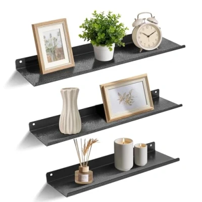 【Sturdy Floating Shelves】 The floating shelves are made of thickened carbon steel, which is stronger and more durable than normal shelves, providing strong carrying capacity (12KG) and reliable storage for your items. The surface is thickened and spray-painted, which has better anti-rust, anti-scratch and wear resistance. 【Save Space】 The hanging shelf comes in three different sizes to meet the needs of spaces of different sizes, truly maximizing space utilization. Effectively help you save floor space and make your room more tidy and organized. You can place photo frames, books, small plants or decorations on the iron shelf to organize your home space. 【Classic & Stylish】 The wall-mounted shelf has a simple and elegant design, and its special black-bottom silver flower texture can be easily integrated into various aesthetic styles. Whether it is modern minimalist style or retro style, it can be used to embellish the space. 【Humanized Design】 Unlike other floating shelves, it adopts professional design, and the metal front edge provides additional protection to prevent items from slipping or falling, ensuring the safety of items. The fine grinding of the corners will not hurt your hands and prevent accidental friction. 【Easy to Install】 With the help of a mini level and instructions, it only takes a few screws to fix our wall mounted shelves to the wall. Warm Tips: These screws are not suitable for walls such as drywall and paneling.