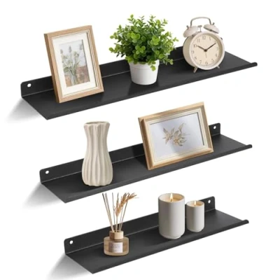 【Sturdy Floating Shelves】 The floating shelves are made of thickened carbon steel, which is stronger and more durable than normal shelves, providing strong carrying capacity (12KG) and reliable storage for your items. The surface is thickened and spray-painted, which has better anti-rust, anti-scratch and wear resistance. 【Save Space】 The hanging shelf comes in three different sizes to meet the needs of spaces of different sizes, truly maximizing space utilization. Effectively help you save floor space and make your room more tidy and organized. You can place photo frames, books, small plants or decorations on the iron shelf to organize your home space. 【Classic & stylish】 The wall-mounted shelf is simple and elegant in design, with a special bright black finish, which can be easily integrated into various aesthetic styles. Whether it is modern minimalist style or retro style, it can become a highlight to embellish the space and enhance the beauty of the overall home. 【Humanized Design】 Unlike other floating shelves, it adopts professional design, and the metal front edge provides additional protection to prevent items from slipping or falling, ensuring the safety of items. The fine grinding of the corners will not hurt your hands and prevent accidental friction. 【Easy to Install】 With the help of a mini level and instructions, it only takes a few screws to fix our wall mounted shelves to the wall. Warm Tips: These screws are not suitable for walls such as drywall and paneling.