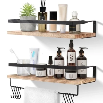 High-Quality Our floating shelves are designed with metal structure and Solid wood and towel holders, durable, bearing capacity strong. Size The size of the floating rack is: 16.53‘’ X 5.9‘’, packed with 2 wooden boards and 1 towel bar, 1 level, 8 screws, 8 hooks. Each board has a weight capacity of 33 lbs 15 kg , making it ideal for small items. Wider and Sturdier of Floating Shelves Solid wood with 0.6inch width metal frame, make it strong and looks textural quality. Shelves for Wall The Solid wood boards compliment the industrial metal brackets to give a simple yet modern design Floating shelves are versatile and can fit in with a wide range of home décor and be installed in the living room, bathroom, bedroom, kitchen and office. Easy to Install All components are included in the package. Follow the instructions and the wall shelf is so simple to install. Feel free to contact us if you experience any problems.