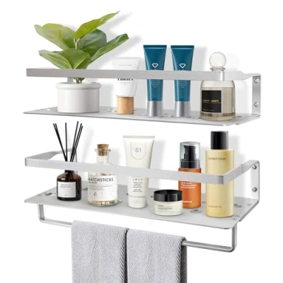 【Premium Wall Mounted Shelves & Unique Design】Floating shelf is made of advanced Space Aluminum for lightweight and durable. The wall Shelves comes with frosted texture guard rail and towel bar for easy storage. The bottom of the shelves are hollowed out for better waterproof and moisture resistance. Space aluminum material makes the floating shelves more unique and lightweight than other ordinary wooden shelves. 【Updated Design & Multifunctional】Updated space aluminum shelves are distinctive, with a rounded skeletonized design at the bottom that is not afraid of water damage, as well as an overall 60% lighter than wooden floating shelves, twice as easy to install and use, perfect for storing toiletries, kitchenware, housewares, cosmetics, and more. 【Easy to Install & Durable】Comes with all the necessary accessories for simple installation. With the help of a mini level and instruction manual, just a few screws to fix our floating bracket to the wall.With a maximum weight capacity of 20 pounds, the hanging shelves can hold strong weights and stay on the wall without falling. 【Guardrail Design & Towel Rack & Perfect Gift】With a 3" high three-sided guardrail design, effectively avoiding the falling of items. With a towel rail of the bathroom shelf, you can hang towels, clothes, kitchen utensils, prizes and other supplies. This beautiful wall shelf is a great way to display your collection and makes a great gift idea for your friends and family. 【Advanced Floating Shelf Package】The package includes 2 space aluminum floating shelves for wall (15.7''L x 5.9''W x 3''H), 1 towel bar, necessary wall screws and shelf accessories, installation instructions manual