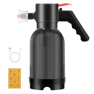 【Labor-Saving & Efficient】One-touch operation, long press to increase pressure, light press to spray, eliminating the fatigue of frequent manual pressurization. Tackle big cleaning jobs without interruption. With LED charging indicator, you can check the remaining power at any time(Tips: Does not support dual Type-C cable charging) 【True Cordless Freedom & Portability】Battery-powered design eliminates tangled hoses and restrictive cords. Move freely around cars, houses, patios, or pets without being tethered to an outlet or pressure washer unit. Lightweight and easy to carry anywhere 【80° Large Fan Coverage】130 PSI pressure, electric boost produces denser foam. 80° wide angle coverage easily covers the entire vehicle, making your cleaning work simpler and faster 【Thickened Anti-Tip Base】The thickened design of the base lowers the center of gravity of the spray bottle, making it less likely to be knocked over and broken even when empty. Equipped with a pressure relief valve to prevent high pressure problems, safe and reliable use 【Suitable For a Variety of Cleaning Scenarios】produces rich, adhesive foam, suitable for pre-soaking cars, SUVs, motorcycles, house exteriors, fences, balcony furniture, and even bathing pets. Easily covers large surface areas