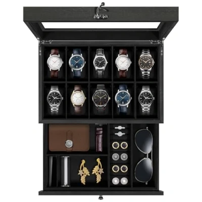 Uten Watch Box 10 Slots, 2 Tier Solid Wood Case with Glass Lid, Metal Clasp, Display for Men and Women, Removable Silk Cotton Pillow, Black Lining, Jewelry Storage Box, Gift Idea