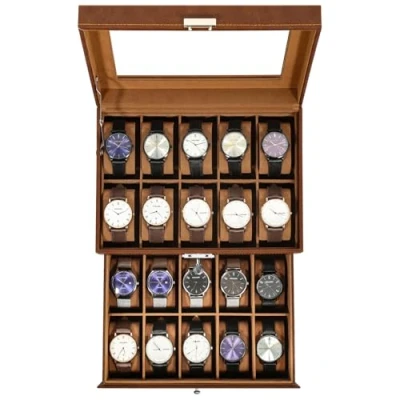 Uten Watch Box 20 Slots, 2 Tier Case with Key Lock, Glass Lid, Display Storage for Men and Women, Brown Synthetic Leather, Velvet Lining, Removable Pillows, Gift Idea