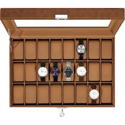Uten Watch Box 24 Slots, Case with Key Lock, Glass Lid, Display Storage for Men and Women, Brown Synthetic Leather, Velvet Lining, Removable Pillows, Gift Idea