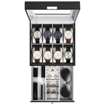 Uten watch box 8 Slots, 2 Tier Case with Key Lock, Glass Lid, display for Men and Women, Black Synthetic Leather, Grey Velvet Lining, Removable Pillows, Jewelry Storage Box, Gift Idea