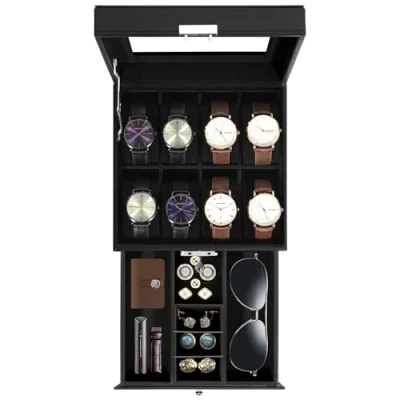 Uten Watch Box 8 Slots, 2 Tier Case with Key Lock, Glass Lid, Display for Men and Women, Black Synthetic Leather, Velvet Lining, Removable Pillows, Jewelry Storage Box, Gift Idea