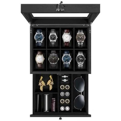 【Strong and Durable】The outer frame of the watch box is made of high-quality Phoenix-Tree wood, which is environmentally friendly, no paint, no smell, retaining the natural texture. The interior is made of smooth velvet fabric and equipped with a soft silk cotton pillow, which has good support and protects the watch from scratches 【Large Capacity & Double Layer Design】Double layer pull-out design, easy to use and large capacity. The top layer can store 8 watches, and the widened and deepened compartments can accommodate different types of watches with a dial diameter of less than 50mm. The bottom layer can store jewelry, bracelets, necklaces, rings, earrings and other accessories, which can keep your watches and jewelry in order 【Large Glass Lid】Transparent visual glass, displaying your watch collection at a glance, preventing your watch from dust, and helping you to find your watches quickly 【Safety Buckle】Exquisite metal buckle decoration makes the watch box more beautiful, firm and rust-proof, easy to open and close, and can be operated with one hand 【Gift Idea】Rustic and practical, it can meet your storage and storage needs. It is a great gift for your family, friends, and watch lovers, Weight: 2.425084882 pounds, Manufacturer: Uten