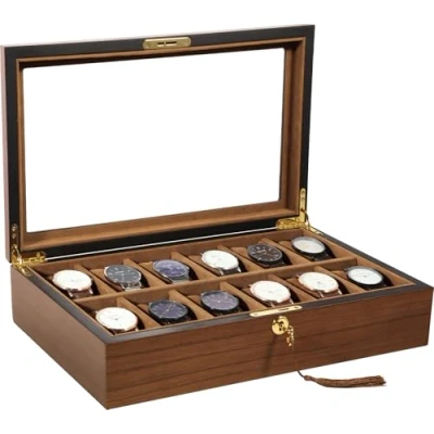 [Advanced Premium Wood Material] The watch box is made of durable, beautiful wood. Features a clear transparent lid, brown suede leather interior and sturdy metal fittings to store and keep your watches and other jewellery organised and clean. [12 Multifunctional Slots] The watch jewellery box can hold up to 12 watches with a maximum dial size of 50mm and the slots allow the cushions to be easily removed to store your accessories such as cufflinks, earrings, rings, bracelets, necklaces, brooches and other gadgets. [Considerate Details] Golden metal lock particularly designed for your expensive timepieces safe and secure. This wooden watch case is easy to upkeep, requiring only a quick wipe with a damp clot. [Considerate [Protective Function] The wooden watch rrganiser is a wonderful item that allows a gentleman or a lady to display his or her entire collection of chronometers, tastefully protecting, storing and organising watches and jewellery.Details] Golden metal lock particularly designed for your expensive timepieces safe and secure. This wooden watch case is easy to upkeep, requiring only a quick wipe with a damp clot. [Wide Application]This watch jewellery box evokes a sense of class and charm, perfect for private storage and commercial display, keeping your valuable timepieces from dust. It is a great gift for any celebration or festival like graduation, Christmas, birthday, promotion, vacation, retirement, etc.