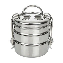 120(H)x115(W)x130(D)mm. Stainless Steel. Silver. Three-tiered design is ideal for serving multiple food types in a single vessel. Tight fitting helps to lock-in heat and flavour. Clasp mechanism prevents contents from leaking.