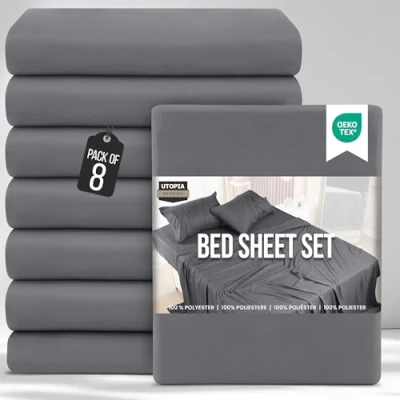 Bed Sheet Set (Pack of 8) - Utopia Bedding double size 4-piece bed sheet set includes 1 flat sheet measuring 225 x 255 cm, 1 fitted sheet measuring 135 x 190 cm with 35 cm deep pocket and 2 pillowcases measuring 50 x 75 cm with 10 cm envelope closure. (DUVET COVER NOT INCLUDED) Brushed Polyester Microfiber – Brushed polyester-microfiber fabric makes the sheet set exceptionally soft, smooth and comfortable that keeps you warm in winters and cool during the summers. All-Around Elastic - The all-around elastic used in the fitted sheet makes it fit easily onto the mattress while giving a nice finish to the bed. Shrink and Fade Resistant - The microfiber material is processed to make it resistant to shrinkage and fading which adds to the longevity of the set by keeping it in great condition. Easy Care - Machine wash cold, gentle cycle, do not bleach, tumble dry on low heat and iron on low heat.