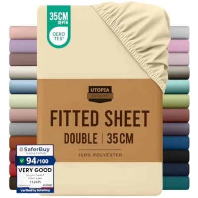 Double Fitted Bed Sheet - Includes 1 Utopia Bedding fitted sheet 135x190cm with 35 cm deep pockets. Brushed Polyester Microfiber - The brushed microfiber fabric makes the fitted sheet exceptionally soft, smooth and comfortable, keeping you warm in winter and cool in summer. All-Around Elastic - The fitted sheet easily conforms to the mattress with all-around elasticity, giving the bed a beautiful finish. Shrink And Fade Resistant - The microfiber material is processed to be shrink and fade resistant, which contributes to the durability of the fabric. Easy Care - Machine wash cold, gentle cycle, do not bleach, tumble dry on low heat and iron on low heat OEKO-TEX Certified & Skin-Friendly – Gentle, safe, and comfortable for every skin type, meeting the highest safety standards.
