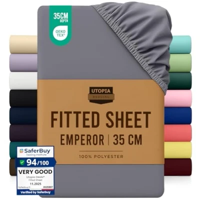 Emperor Fitted Bed Sheet - Includes 1 Utopia Bedding fitted sheet 200x200cm with 35 cm deep pockets. Brushed Polyester Microfiber - The brushed microfiber fabric makes the fitted sheet exceptionally soft, smooth and comfortable, keeping you warm in winter and cool in summer. All-Around Elastic - The fitted sheet easily conforms to the mattress with all-around elasticity, giving the bed a beautiful finish. Shrink And Fade Resistant - The microfiber material is processed to be shrink and fade resistant, which contributes to the durability of the fabric. Easy Care - Machine wash cold, gentle cycle, do not bleach, tumble dry on low heat and iron on low heat