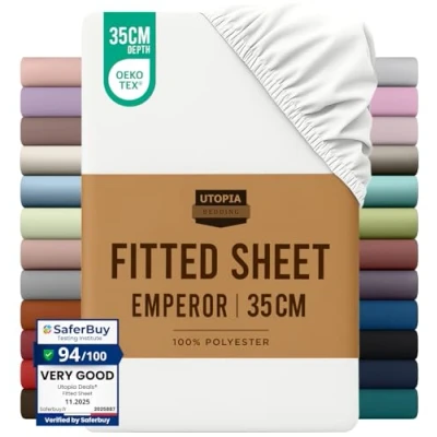 Emperor Fitted Bed Sheet - Includes 1 Utopia Bedding fitted sheet 200x200cm with 35 cm deep pockets. Brushed Polyester Microfiber - The brushed microfiber fabric makes the fitted sheet exceptionally soft, smooth and comfortable, keeping you warm in winter and cool in summer. All-Around Elastic - The fitted sheet easily conforms to the mattress with all-around elasticity, giving the bed a beautiful finish. Shrink And Fade Resistant - The microfiber material is processed to be shrink and fade resistant, which contributes to the durability of the fabric. Easy Care - Machine wash cold, gentle cycle, do not bleach, tumble dry on low heat and iron on low heat OEKO-TEX Certified & Skin-Friendly – Gentle, safe, and comfortable for every skin type, meeting the highest safety standards.