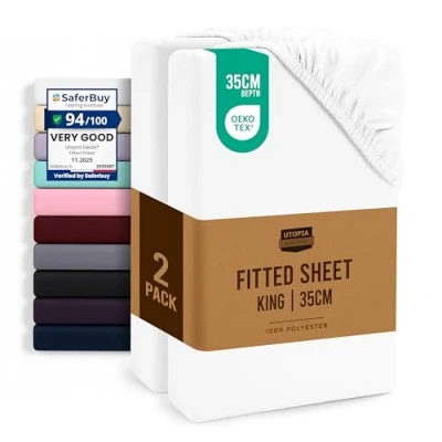 King Fitted Bed Sheet - Includes 2 fitted sheets 150x200cm by Utopia Bedding with 35 cm deep pockets. Brushed Polyester Microfiber - The brushed microfiber fabric makes the fitted sheet exceptionally soft, smooth and comfortable, keeping you warm in winter and cool in summer. All-Around Elastic - The fitted sheet easily conforms to the mattress with all-around elasticity, giving the bed a beautiful finish. OEKO-TEX Certified – Our Fitted sheets are certified to meet global safety requirements, offering trusted quality and comfort. Shrink And Fade Resistant - The microfiber material is processed to be shrink and fade resistant, which contributes to the durability of the fabric. Easy Care - Machine wash cold, gentle cycle, do not bleach, tumble dry on low heat and iron on low heat