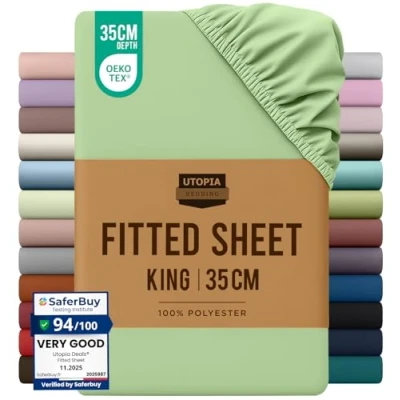 King Fitted Bed Sheet - Includes 1 Utopia Bedding fitted sheet 150x200cm with 35 cm deep pockets. Brushed Polyester Microfiber - The brushed microfiber fabric makes the fitted sheet exceptionally soft, smooth and comfortable, keeping you warm in winter and cool in summer. All-Around Elastic - The fitted sheet easily conforms to the mattress with all-around elasticity, giving the bed a beautiful finish. Shrink And Fade Resistant - The microfiber material is processed to be shrink and fade resistant, which contributes to the durability of the fabric. Easy Care - Machine wash cold, gentle cycle, do not bleach, tumble dry on low heat and iron on low heat OEKO-TEX Certified & Skin-Friendly – Gentle, safe, and comfortable for every skin type, meeting the highest safety standards.