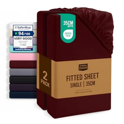 Single Fitted Bed Sheet - Includes 2 fitted sheets 90x190cm by Utopia Bedding with 35 cm deep pockets. Brushed Polyester Microfiber - The brushed microfiber fabric makes the fitted sheet exceptionally soft, smooth and comfortable, keeping you warm in winter and cool in summer. All-Around Elastic - The fitted sheet easily conforms to the mattress with all-around elasticity, giving the bed a beautiful finish. OEKO-TEX Certified – Our Fitted sheets are certified to meet global safety requirements, offering trusted quality and comfort. Shrink And Fade Resistant - The microfiber material is processed to be shrink and fade resistant, which contributes to the durability of the fabric. Easy Care - Machine wash cold, gentle cycle, do not bleach, tumble dry on low heat and iron on low heat