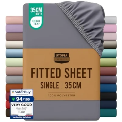 Single Fitted Bed Sheet - Includes 1 Utopia Bedding fitted sheet 90x190cm with 35 cm deep pockets. Brushed Polyester Microfiber - The brushed microfiber fabric makes the fitted sheet exceptionally soft, smooth and comfortable, keeping you warm in winter and cool in summer. All-Around Elastic - The fitted sheet easily conforms to the mattress with all-around elasticity, giving the bed a beautiful finish. Shrink And Fade Resistant - The microfiber material is processed to be shrink and fade resistant, which contributes to the durability of the fabric. Easy Care - Machine wash cold, gentle cycle, do not bleach, tumble dry on low heat and iron on low heat OEKO-TEX Certified & Skin-Friendly – Gentle, safe, and comfortable for every skin type, meeting the highest safety standards.