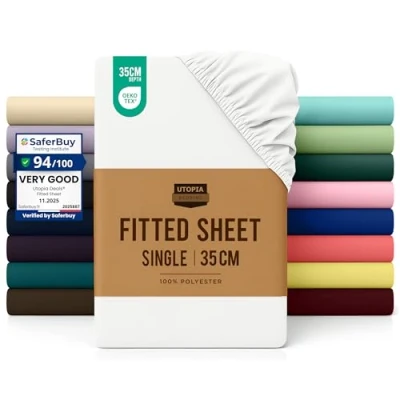 Single Fitted Bed Sheet - Includes 1 Utopia Bedding fitted sheet 90x190cm with 35 cm deep pockets. Brushed Polyester Microfiber - The brushed microfiber fabric makes the fitted sheet exceptionally soft, smooth and comfortable, keeping you warm in winter and cool in summer. All-Around Elastic - The fitted sheet easily conforms to the mattress with all-around elasticity, giving the bed a beautiful finish. Shrink And Fade Resistant - The microfiber material is processed to be shrink and fade resistant, which contributes to the durability of the fabric. Easy Care - Machine wash cold, gentle cycle, do not bleach, tumble dry on low heat and iron on low heat OEKO-TEX Certified & Skin-Friendly – Gentle, safe, and comfortable for every skin type, meeting the highest safety standards.