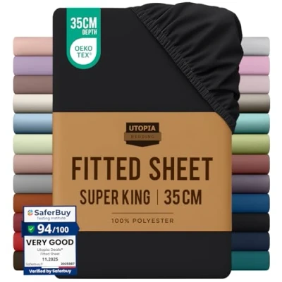 Super King Fitted Bed Sheet - Includes 1 Utopia Bedding fitted sheet 180x200cm with 35 cm deep pockets. Brushed Polyester Microfiber - The brushed microfiber fabric makes the fitted sheet exceptionally soft, smooth and comfortable, keeping you warm in winter and cool in summer. All-Around Elastic - The fitted sheet easily conforms to the mattress with all-around elasticity, giving the bed a beautiful finish. Shrink And Fade Resistant - The microfiber material is processed to be shrink and fade resistant, which contributes to the durability of the fabric. Easy Care - Machine wash cold, gentle cycle, do not bleach, tumble dry on low heat and iron on low heat OEKO-TEX Certified & Skin-Friendly – Gentle, safe, and comfortable for every skin type, meeting the highest safety standards.