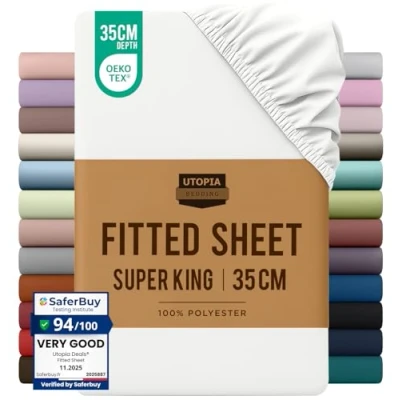 Super King Fitted Bed Sheet - Includes 1 Utopia Bedding fitted sheet 180x200cm with 35 cm deep pockets. Brushed Polyester Microfiber - The brushed microfiber fabric makes the fitted sheet exceptionally soft, smooth and comfortable, keeping you warm in winter and cool in summer. All-Around Elastic - The fitted sheet easily conforms to the mattress with all-around elasticity, giving the bed a beautiful finish. Shrink And Fade Resistant - The microfiber material is processed to be shrink and fade resistant, which contributes to the durability of the fabric. Easy Care - Machine wash cold, gentle cycle, do not bleach, tumble dry on low heat and iron on low heat OEKO-TEX Certified & Skin-Friendly – Gentle, safe, and comfortable for every skin type, meeting the highest safety standards.