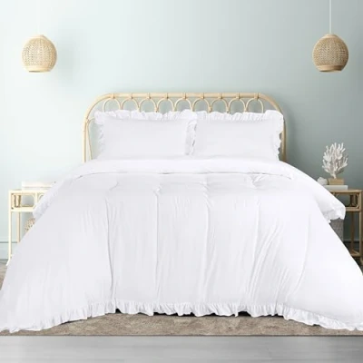 Ruffle Duvet Cover Set - Includes 1 ruffle duvet cover measuring 230x220 cm with zippered closure, 2 ruffle pillowcases measures 50x75 cm with envelope closure; comforter sold separately. Brushed Microfiber Polyester - Brushed microfiber polyester fabric makes them soft, breathable, iron easy, fade resistant and protect against any shrinkage after washing. Durable - High tensile strength makes it strong, durable and less likely to rip or tear. Perfectly Stitched Closure - The closure is perfectly stitched to keep the duvet in place. Easy Care - Machine wash cold, gentle cycle, do not bleach, tumble dry on low heat and iron on low heat.