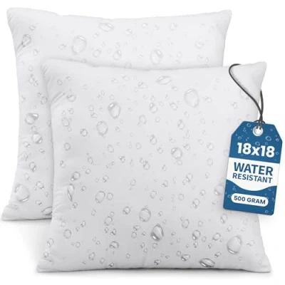 THROW PILLOW PACK OF TWO – Masterly crafted pillows with dimension 18 x 18 inches, designed to provide an exceptional level of comfort while adjusting to the modern bedding setting. WATER RESISTENT PILLOWS - The feature allows usability for outdoor and indoor, and are perfect for everyday use in your bedroom, guest room, at the beach, or even during traveling. The decorative pillows provide enhanced support to help you relax and unwind for a restful night's sleep wherever you are. ENCHANTING AESTHETICS – These white throw pillows come with elegant aesthetics creating their own space in a modern bedroom theme for a lavish look. MATERIAL COMPOSITION – These water-resistant pillows are composed of Virgin Poly Staple fiber coupled with smooth and soft fabric that allows improved air circulation and low water absorption. ALL-SEASON COMFORT – Whether it is hot and humid or cold and damp, these throw pillows provide a soft touch and protection year-round, making them a versatile choice for any season. DURABLE AND LONGLASTING – The square pillows offer an uninterrupted resting experience with an exceptionally qualitative build allowing for the extended lifespan of the pillows. CARE INSTRUCTIONS – Spot clean is recommended to clean the pillow, the pillow can be handwashed for easy case. Avoid bleaching and machine washing the pillows.