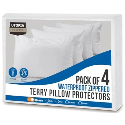 Utopia Bedding Waterproof Pillow Protectors with Zipper Queen Size (4 Pack), Terry Covers, UB3622