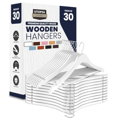 Utopia Home Premium Wooden Hangers 30 Pack Durable & Slim Coat Hanger Suit with 360 Degree Rotatable Hook Wood Shoulder Grooves (White Color)