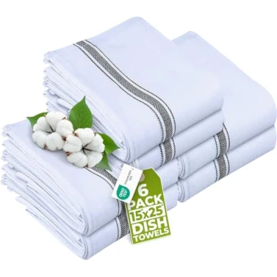 STRONG AND LONG-LASTING MATERIAL- Made from 100% ring spun cotton, the dish towels are durable and firm enough to withstand repeated uses and washings. The towels have a side stripe design that makes them look decent and elegant. VALUE PACK OF 6- Commercial pack of 6 ensures that you have enough towels at hand for cleaning and cooking needs in the kitchen, restaurants or dining tables or simply anywhere at home where spills are usual. HIGHLY ABSORBENT- The kitchen linen sets are lightweight, super absorbent and do not leave any trace of lint. Gentle weave makes it soft enough to prevent scratches on your delicate cookware, plates and pans while cleaning. MULTIPURPOSE- Stylish and functional, these kitchen towels come in handy that are not only capable of cleaning dishes but can also be used to wipe up spills, clean off cutting boards, dry hands and even hold hot plates and dishes. CARE INSTRUCTIONS- Machine washable. Tumble dry on low. It’s recommended to wash it separately on first use to minimize lint. Unit count : 6.0