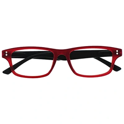 Stylish mens/womens/unisex reading glasses. For indoors/normal reading conditions. Sturdy frame design with spring hinges. Rubberized red black finish. Strength +1.50.