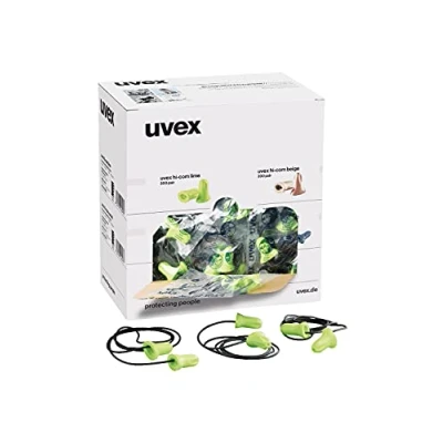 The innovative shape of the Uvex hi-com earplugs reduces the level of sound that normally builds up in the inner ear when wearing hearing protection. Integrated cavities result in a larger surface area in the direction of the eardrum. The earplugs provide softer acoustics and absorb disruptive noises they also allow excellent speech perception. General features* Earplugs with low sound absorption and excellent speech perception* Available colours: lime, fawn* Version with cordProtection features* Meets standard EN 352-2 and the additional requirement Warning signal hearing, general (W)* 24 decibels insulation H: 26 dB, M: 20 dB, L: 18 dB
