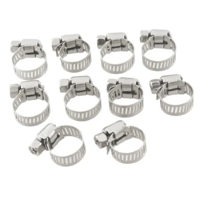 hose clamp, with 8mm width and 0.6mm thickness adjustable stainless steel band. Fit Hose Diameter : 9-16mm/ 0.35"~0.63";Band Size : Width: 8mm/0.3"; Thickness: 0.6mm/0.02" Overall Size : 24 x 22 x 10mm/0.9" x 0.9" x 0.4"(L*W*H);Color : Silver Tone Weight : 64g;Product Name : Hose Clamp;Material : Stainless Steel Package Content : 10 x Hose Clamps, Weight: 0.1322773572 Pounds, Manufacturer: uxcell