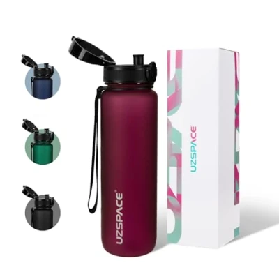 Safe & Reliable Material: Made of quality food-grade and environment-friendly plastic - Tritan, UZSPACE sports water bottle is 100% BPA-free. Tritan is non-toxic and odorless, which is great for your family. In addition tritan water bottle is not only highly impact-resistant and drop-proof, but also highly transparent, allowing you to easily track your daily water intake with the thoughtfully designed capacity scale Unique Design: First with one-hand opening mechanism and a flip-top lid, you can just press the button of UZSPACE water bottle 1l when you want to rehydrate. No more struggling with twist caps! Second the drinking spout contours to your lips for drip-free drinking, a vent on the lid ensures a consistent flow. Finally its removable wrist strap makes this cycling water bottle easy to carry Triple Leakproof System: With a safety lock, a silicone seal and silicone stoppers, our gym water bottle is 100% leakproof. Whether in rapid motion or lying in your backpack, it won't open accidentally or leak Large Capacity: This 1l waterbottles for adults is practical. Its wide mouth makes it easy to add ice, juice and all types of beverages, and it’s even suitable for carbonated drinks. Also with the removable filter strainer, you can add the fruit of choice in this big water bottle to turn your water into a healthy concoction to start your day Elegant & Functional: This water bottle features a modern design. The matte smooth finish and exquisite gift packaging make it the great gift for friends, family and lover. UZSPACE personalised water bottle is the great companion for work, fitness, sports or travel use. And it fits most backpack/bike/car bottle holders (78mm diameter)