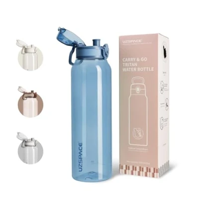 Healthy & Durable: Made of quality food-grade and environment-friendly plastic - Tritan, UZSPACE sports water bottle is safe and non-toxic. Tritan is 100% BPA-free and odorless, which is safe for you. In addition tritan water bottle is not only highly impact-resistant and drop-proof, but also highly transparent, allowing you to easily track your daily water intake with the thoughtfully designed capacity scale Thoughtful Design: First with one-hand opening mechanism and a flip-top lid, you can just press the button of UZSPACE clear water bottle when you want to rehydrate. No more struggling with twist caps! Second the drinking spout contours to your lips for drip-free drinking, a vent on the lid ensures a consistent flow. Finally its ergonomic handle makes this big water bottle easy to carry or hang Triple Leakproof System: With a safety lock, a silicone seal and silicone stoppers, our gym water bottle is 100% leakproof. Whether in rapid motion or lying in your backpack, this water bottle won't open accidentally or leak, keeping your bag’s contents completely dry. Also we provide a set of extra sealing rings for you to replace to extend the service life of this daily water intake bottle Big Capacity & Easy to clean: This 1 litre water bottle (1050ml) is practical. Its wide mouth makes it easy to add ice, juice and all types of beverages, and it’s even suitable for carbonated drinks. Also UZSPACE large water bottle is designed for easy hand washing and is also dishwasher safe Ideal Gift Choice & Multi-Use: This gym water bottle features a modern design and comes in elegant gift packaging, making it the great gift for friends, family and lover. And truly a reusable drinking bottle for the whole family. UZSPACE personalised water bottle is the great companion for work, fitness, sports or travel use. And it fits most backpack/bike/car bottle holders (80mm diameter)