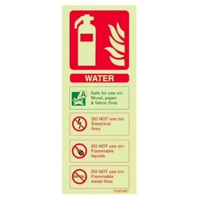 Glow-in-the-dark design ensures visibility even during power failures – Photoluminescent material charges using ambient light and glows brightly in darkness, helping personnel locate the water extinguisher in low-light emergencies. Identifies water fire extinguishers clearly with bold icons and colours – Features red, green and black graphics with ISO 7010 symbols for quick identification of extinguisher type and suitable uses in high-pressure fire response scenarios. Compact 75 × 200 mm portrait layout ideal for mounting in tight spaces – Space-saving format fits above or beside fire extinguisher points, cabinets or signage boards, making it perfect for use in corridors, offices, and commercial buildings. Made from durable 1mm rigid plastic for reliable indoor performance – Lightweight yet sturdy construction offers long-lasting fire safety signage suitable for warehouses, shops, workplaces, schools and other public environments. Complies with BS 5499 and EN ISO 7010 safety signage standards – Designed to meet UK fire regulation requirements with internationally recognised symbols, helping ensure staff and visitors follow safe extinguisher usage protocols.