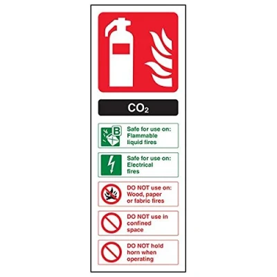 Helps fulfil obligations to convey essential information relating to fire fighting equipment as per Health and Safety (Safety Signs & Signals) Regulations 1996 Conforms to EN ISO 7010:2012 Portrait Orientation. Sign reads "Safe For Use On Flammable Liquid Fires/Electrical Fires. DO NOT Use On Wood, Paper or Fabric Fires/Use In Confined Space. DO NOT Hold Horn When Operating" Highly durable Self Adhesive Vinyl material and screen printed message will stand the test of time Sign measures 100 x 280mm. Self Adhesive material will adhere securely to most surfaces